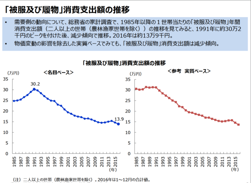 調べていて意外だったのは衣料品の消費額が年々減少しているということです。