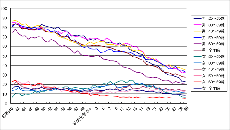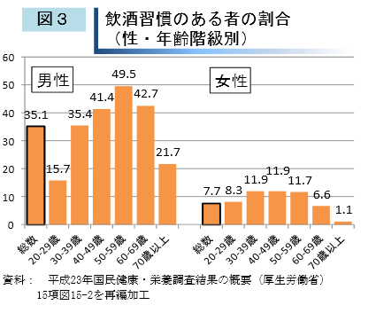 年代別で見てみると、少し古いデータですが、明らかに20−29歳の飲酒習慣が低くなっています。